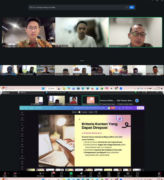 Dalam rangka meningkatkan penyebarluasan informasi melalui media sosial yang dinilai paling efiktif maka pada hari ini Bawaslu RI melaksanakan rapat melalui media Zoom Meeting membahas Standarisasi Kolaborasi Konten Media Sosial Bawaslu Provinsi dan Bawaslu Kabupaten/Kota. Hal ini dilakukan seiring dengan meningkatnya dan semakin kreatifnya Humas Bawaslu Kabupaten/Kota dalam menghasikan konten edukasi beberapa waktu belakang ini. Tentunya koaborasi konten juga harus memenuhi syarat dan tahapan sesuai dengan petunjuk teknis yang disusun oleh Bawaslu RI.